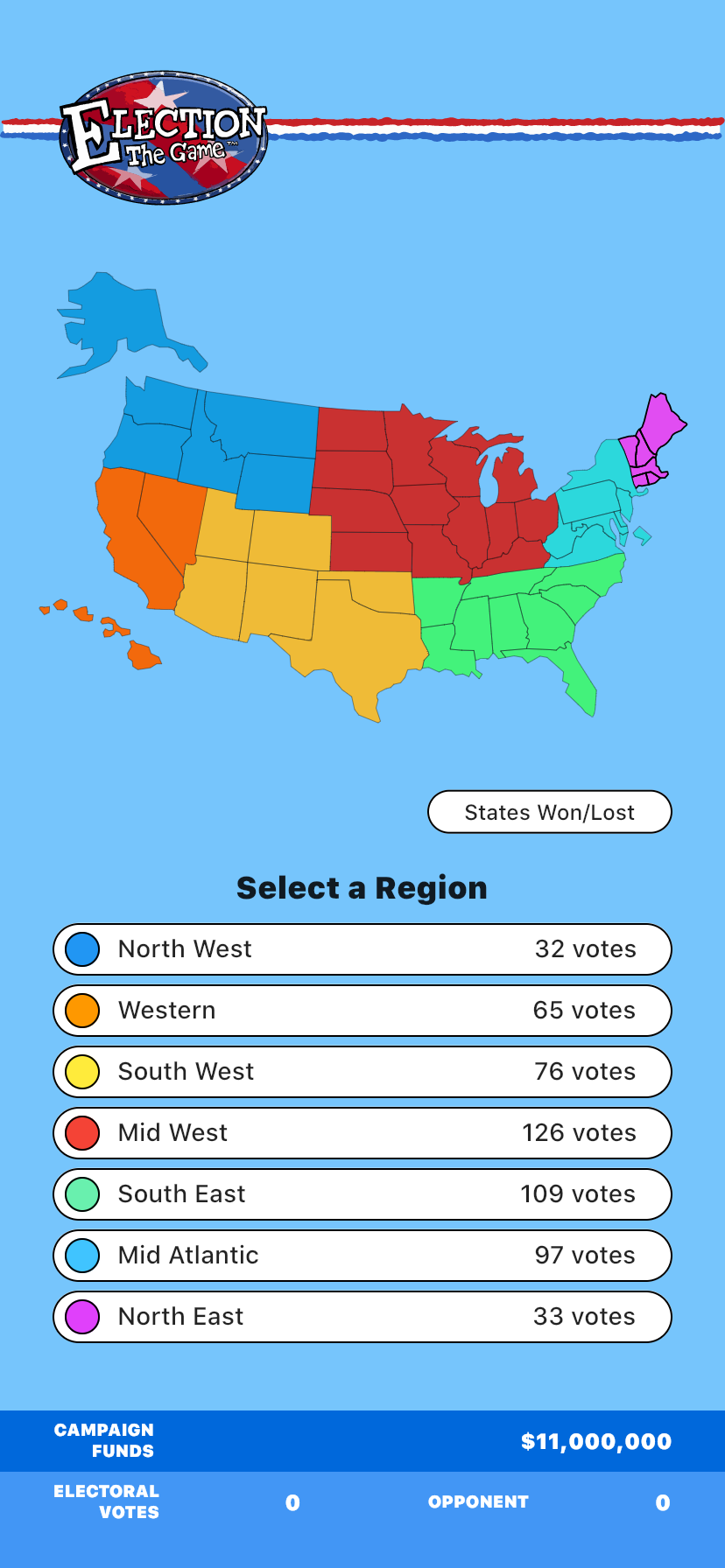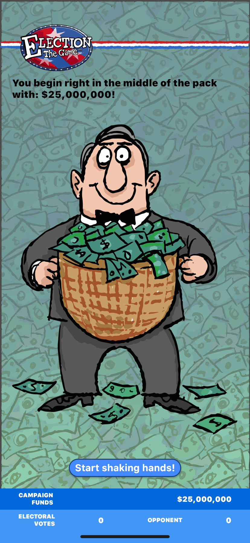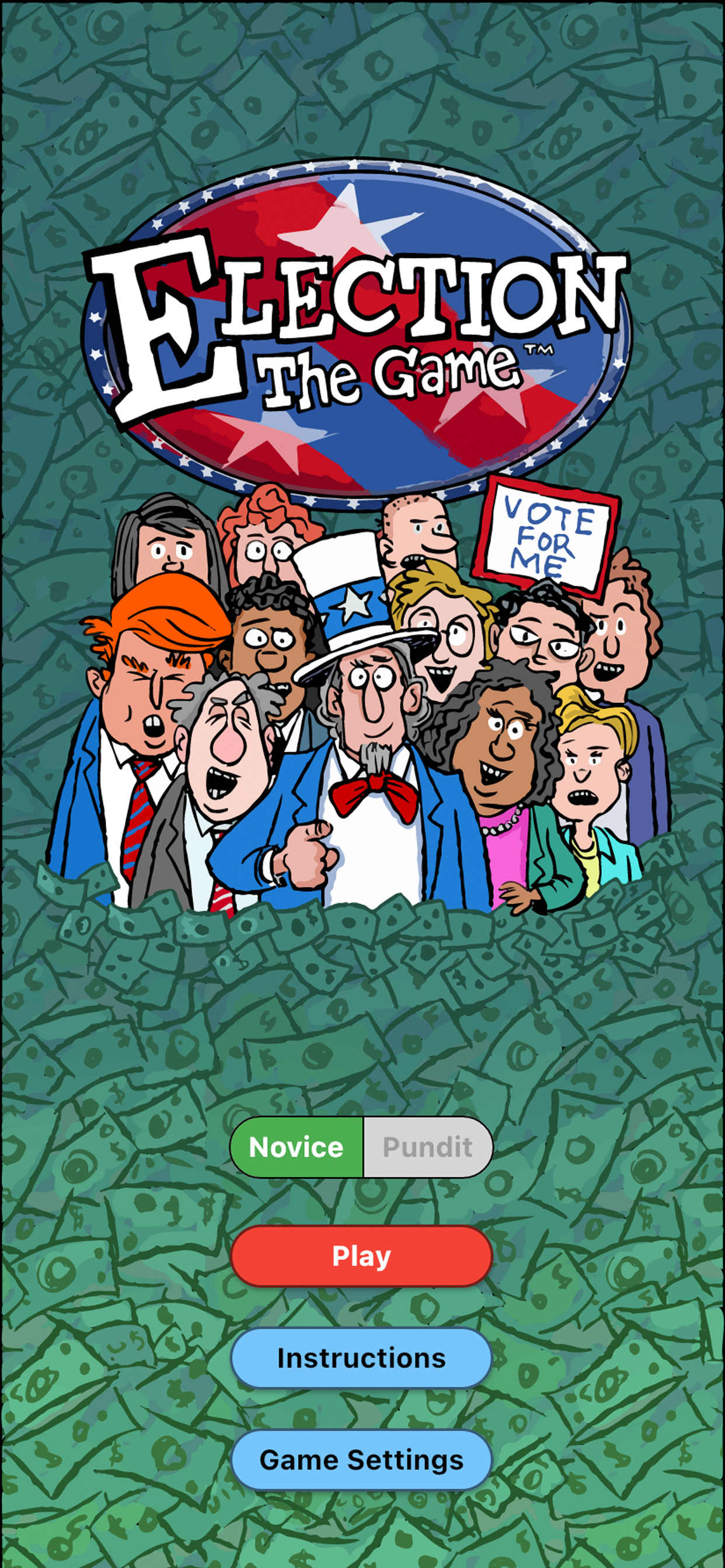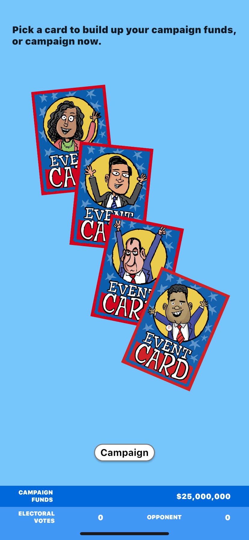Creative direction, illustration, design and game mechanics for a trivia game inspired by current events! You win by raising campaign funds and campaigning across the country by answering questions. For iOS.